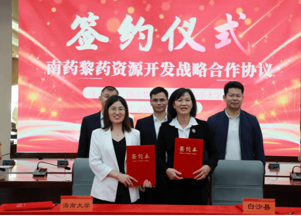 王永珍与黄玲代表双方签署了《南药黎药资源开发战略合作协议》,吴德燕、徐世红、王开琼证签。