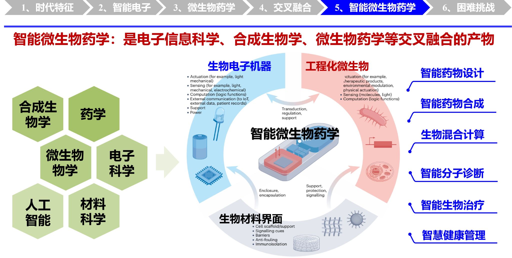 “智能微生物药学是电子信息科学、合成生物学、微生物药学领域相互融合形成的交叉学科方向,是生物智能技术(BT)与人工智能技术(IT)交叉融合的范式创新,其在生物医药、生物制造、环境修复等领域应用潜力巨大。“智能微生物药学”研究团队,通过结合微生物学、药学、计算机科学、电子工程学、材料学等多学科技术手段,基于智能化方法研究利用微生物资源开发新型药物、优化药物生产过程、实现可控递送以及精准医疗。本团队长期专注于智能微生物药学领域相关研究,汇聚了合成生物学、微生物学、生物电子学、材料科学、人工智能等多学科人才,具有多学科交叉融合优势。具体研究聚焦于“可吞服光电子胶囊”,通过研发光员工物电子接口技术,用于探索碳基生命与硅基电子间物质、能量、信息的交互机制和调控策略,推动胃肠道诊疗技术研发。