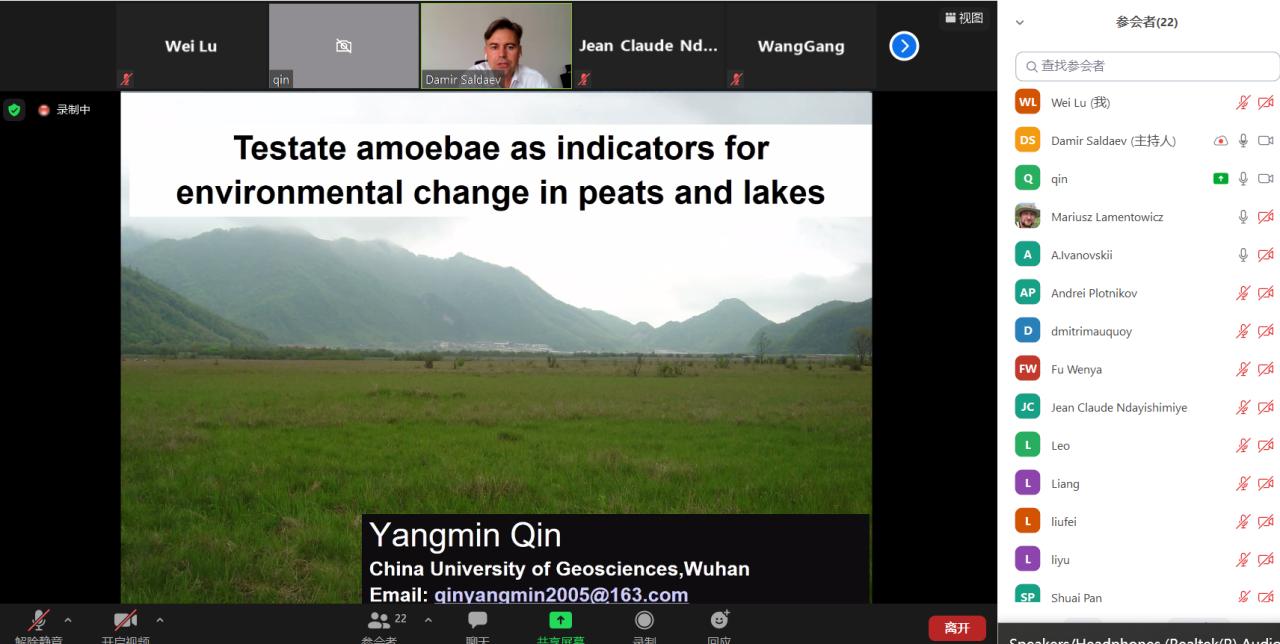 北京时间18点,线上学术会议正式开始,主持人Saldaev Damir简短介绍了本期学术沙龙主题及演讲者Yangmin Qin教授。随后Qin教授就睾丸变形虫作为泥炭地和湖泊环境变化的指标这一主题,作了题为“Testate amoebae as indicators for environmental change in peatlands and lakes, China”的学术报告,学术讨论气氛热烈。