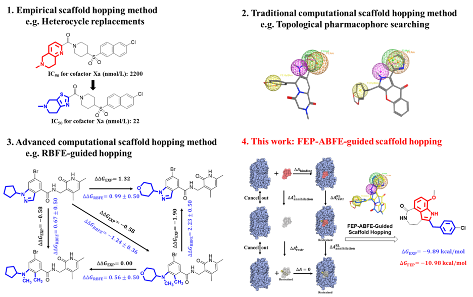 新骨架先导结构的发现是创新药物研究中非常重要的一环。目前,天然产物、高通量筛选、虚拟筛选、组合化学等为创新药物研究提供了丰富多样的化合物样本库,但不足以满足特定靶标对化学结构的精细需求。为此,伟德体育靶向药物设计与发现团队利用自主发展的基于自由能微绕(FEP,Free Energy Perturbation)的药物设计方法并结合药物设计基本理论,成功发展了一种基于自由能微扰的“骨架跃迁”新方法。该方法具有较高的成功率,可为新骨架先导结构的发现提供理论指导与技术支撑。