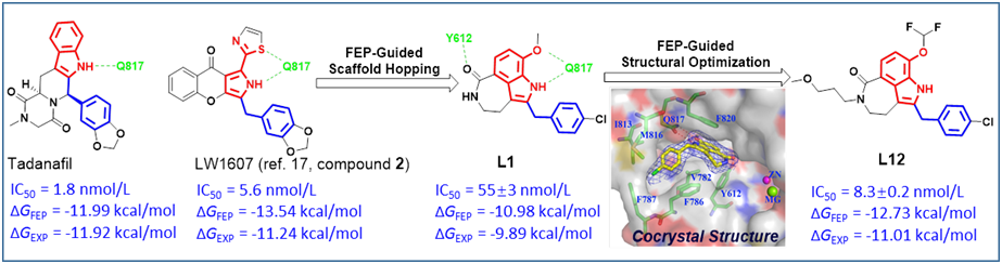 研究中以磷酸二酯酶五型(PDE5)抑制剂的发现为例,精准地从上市药物他达那非骨架跃迁获得活性相当的全新骨架化合物L12(IC50为8.3 nM)。并通过亚型选择性研究、蛋白-小分子共晶研究及初步成药性研究,发现化合物L12具有高效和低毒等特点,具有开发为新型抗肺动脉高压候选药物的潜力。研究进一步验证了基于FEP的骨架跃迁新方法的有效性及可行性,为新骨架创新药物的发现提供重要的指导意义。
