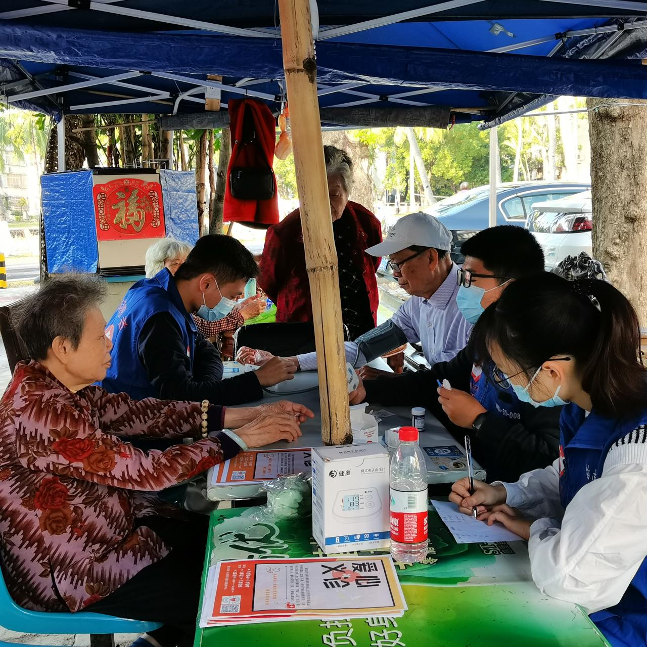 图为支部成员为周围居民测量血压与血糖