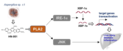 近期,团队利用肝细胞脂质蓄积细胞模型从海洋微生物Aspergillus sp. c1代谢物中筛选发现化合物HN-001可有效降低肝细胞脂质水平,并抑制脂质毒性。进一步机制研究发现HN-001通过抑制磷脂酶A2(PLA2)活性,抑制应激与损伤关键通路IRE-1α/XBP-1s与JNK,保护肝细胞,从而治疗小鼠NAFLD。