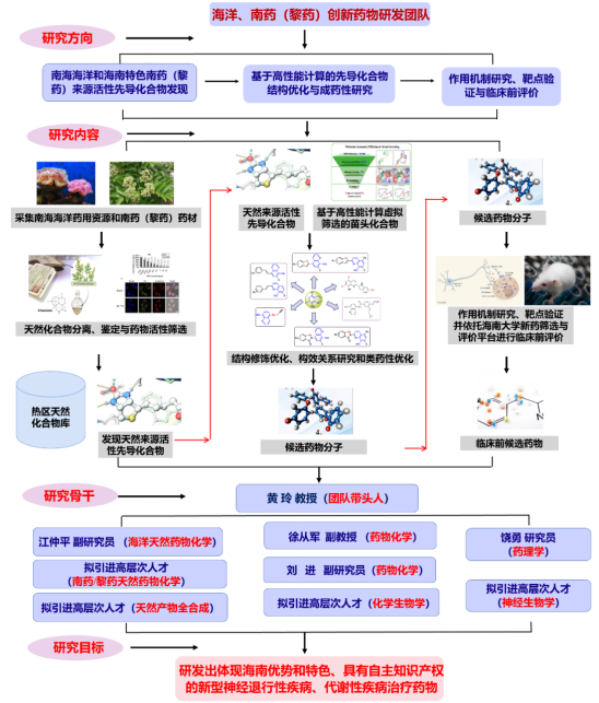 面向国家重大需求,团队以海南省热带特色药用作物与海洋资源为依托,聚焦“神经退行性疾病与慢性肝病创新药物”两个重大科学难题,结合天然药物化学、合成药物化学、化员工物学、计算机辅助药物设计、药理学、细胞分子生物学等理论及实验技术,在“高活性药物分子指导新靶点发现”与“新靶点指导创新药物设计优化”双重模式驱动下,致力于神经退行性疾病、慢性脂肪肝病等重大疾病的药化药理一体化研究,从而实现新药创制。当前,团队已配备天然药物化学、合成药物化学、药理学与细胞分子生物学等方向领域团队力量。