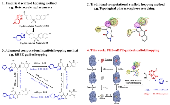 为此,研究团队利用自主发展的基于自由能微绕(Free Energy Perturbation)药物设计新方法,发展“骨架跃迁”关键新技术。该方法具有较高的成功率,明显提高靶标对新骨架结合能力预测,获得高活性新骨架结构,从而提高先导结构的发现和优化效率,推动创新药物研发从先导结构向候选药物的转化(图2)。