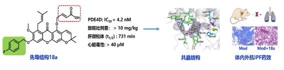 天然产物是寻找新颖骨架化合物的重要来源。伟德体育靶向药物设计与发现团队及其合作者在对天然产物倒捻子素进行优化后获得了先导结构18a,其是一个选择性高、活性强的PDE4抑制剂(IC50为4.2 nM),且具有高效低毒的优势(体内肺纤维化药效是阳性药物吡非尼酮的15倍,口服安全窗是阳性药物罗氟司特的10倍以上),表明先导结构18a具有开发为新型抗IPF候选药物的良好潜力(图3)。